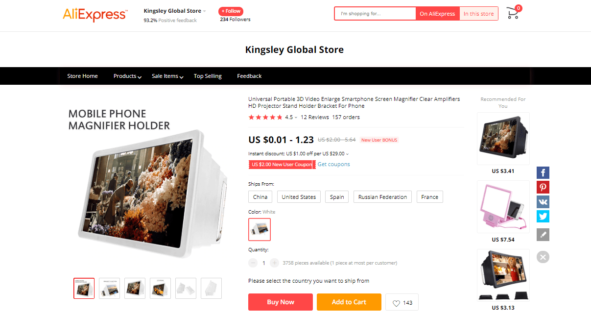 AliExpress find: price – $0.01-1.23, rating – 4.5*, number of orders – 157