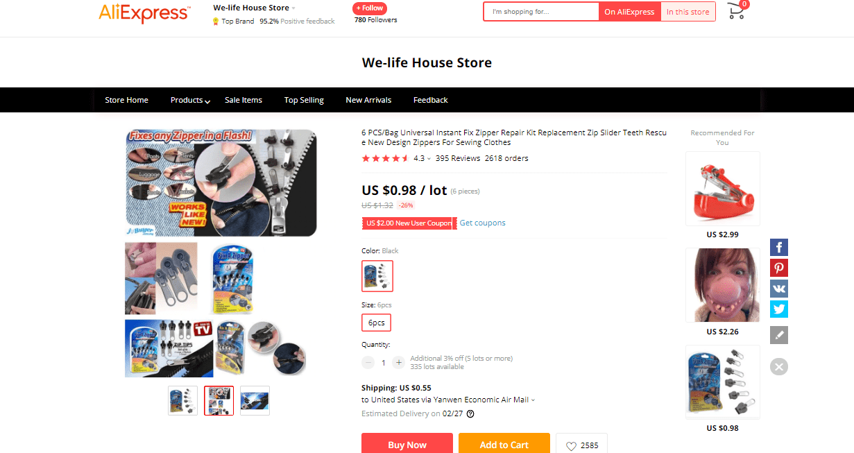 AliExpress find: price – $0.98, rating – 4.3*, number of orders – 2618
