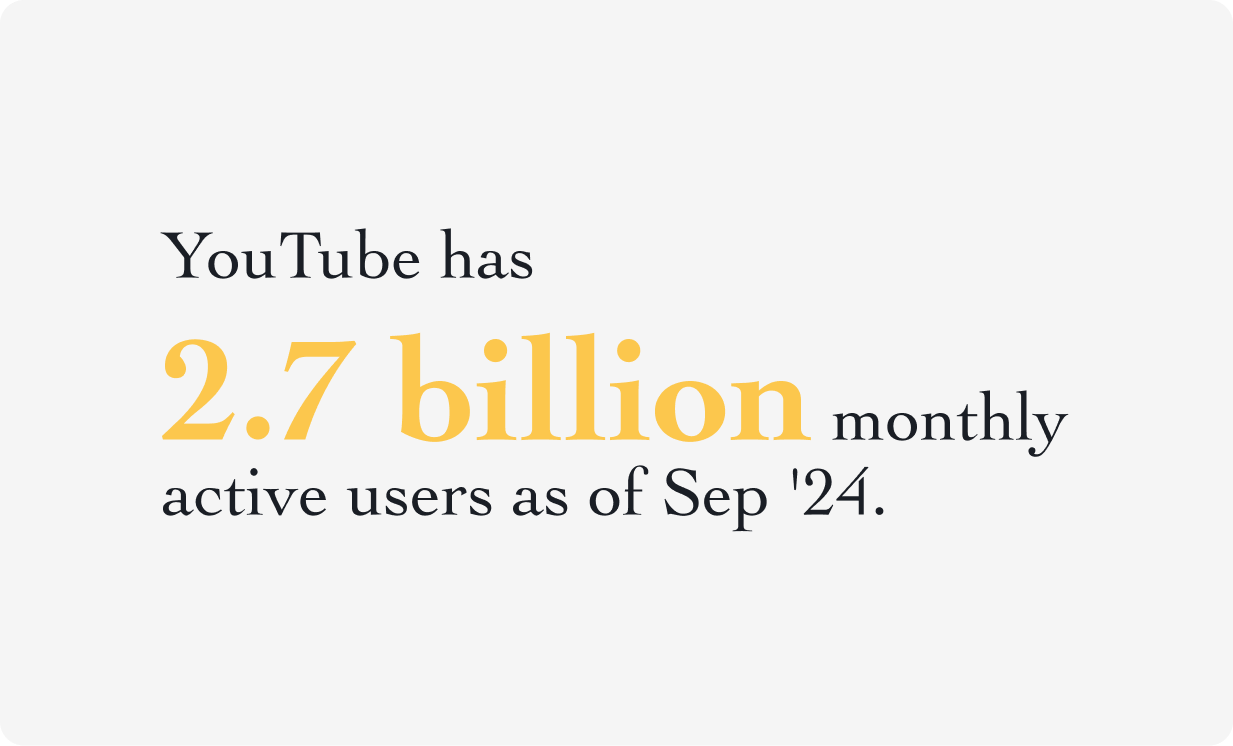 - Massive user base: with over 2.9 billion active monthly users, YouTube gives you access to a vast, diverse audience. Your videos can reach people all over the world, opening up opportunities to connect with viewers globally.
