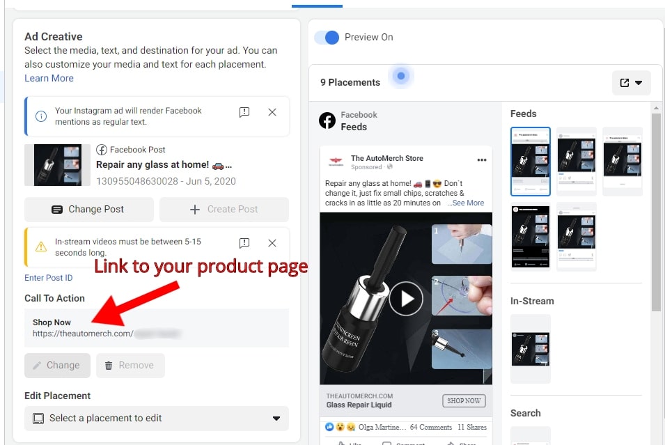 - Make sure to place a call to action in your ad such as “Shop now”, “Click here”, etc.